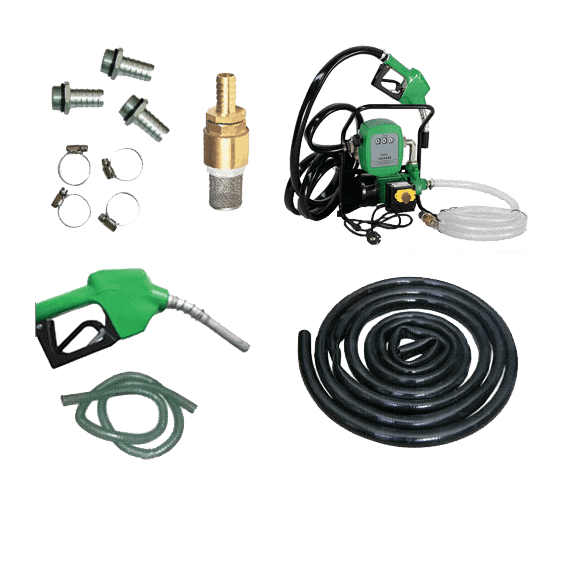 Utöver dieselpumpen innehåller setet även en kran, en lång påfyllningsslang för påfyllning av dieselbränsle, en sugslang för pumpning, en backventil i metall, ett sugmunstycke med filter och fem klämmor för anslutning av påfyllningen och pumpslang till dieselpumpen eller backventilen.