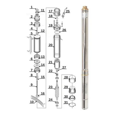 Mehrstufige Tiefbrunnenpumpen mit 3 Zoll (74 mm Durchmesser) und erhöhter Sandbeständigkeit für 3- und 4-Zoll-Brunnen. Eine erhöhte Sandbeständigkeit wird durch den Einsatz „schwimmender Laufräder“ und die Auswahl verschleißfester Materialien erreicht. Der Pumpenkondensator ist in den Motor eingebaut, sodass das elektrische System viel einfacher ist als bei Pumpen mit Steuerkasten. Die Pumpen sind mit einem 20 m langen Standardkabel und einem Stecker erhältlich. Die Pumpen sind mit einem in der Motorwicklung montierten Thermoschutz ausgestattet. Das Pumpendesign ist das gleiche wie bei 3-Zoll-Ti-Pumpen, sie bieten jedoch einen höheren Durchfluss von bis zu 70 l/min