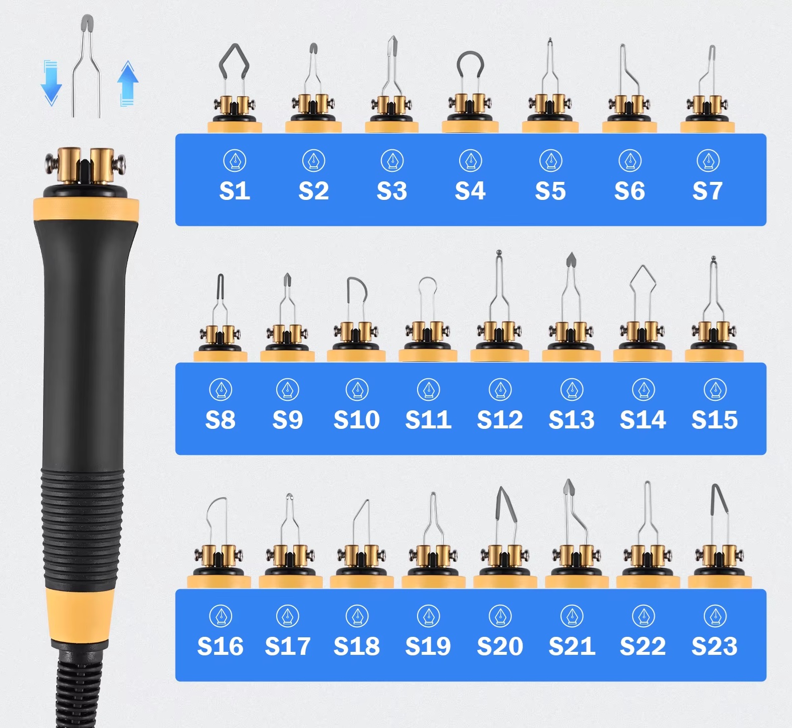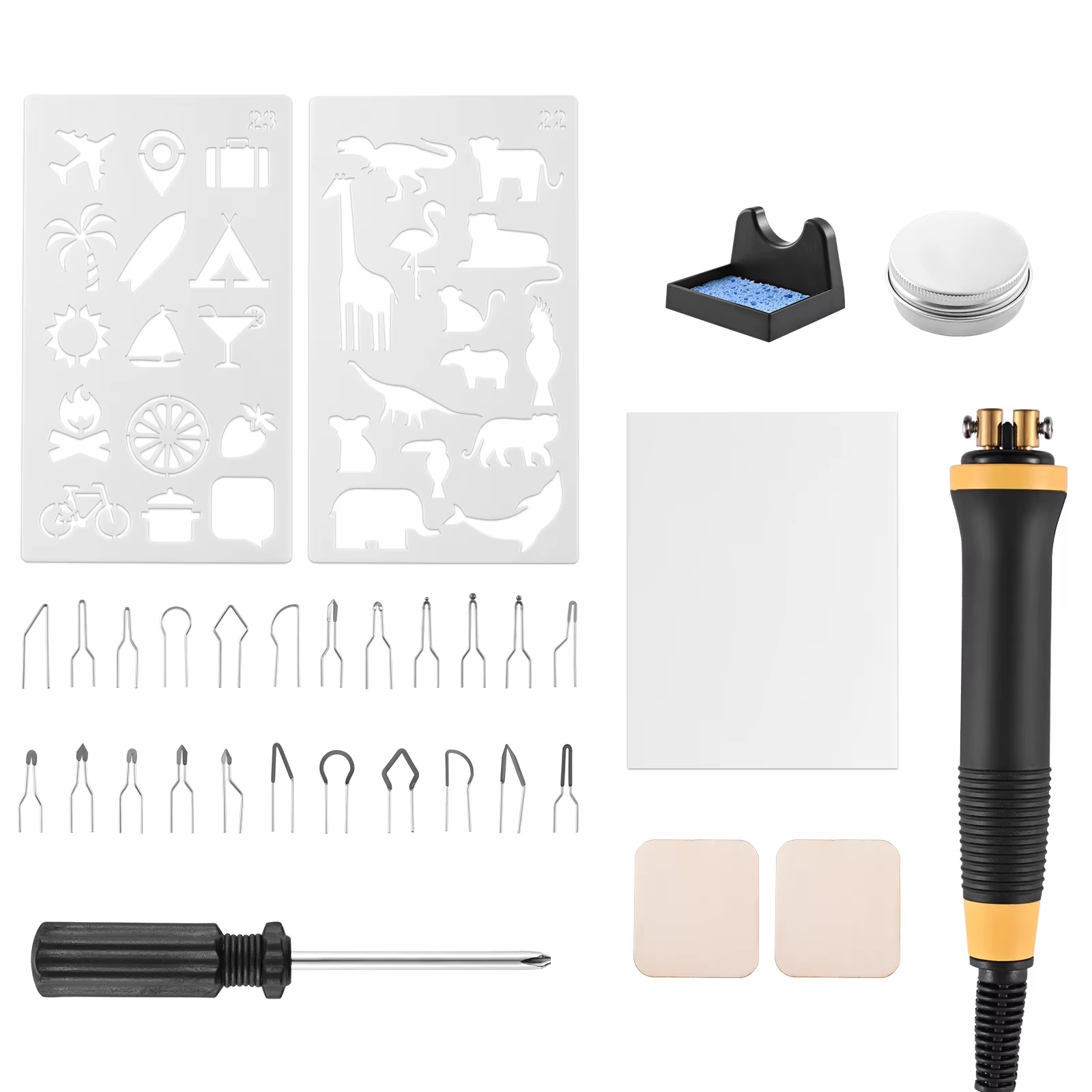 The set includes 25 different tips, seals, knives and ignition stamps. It is also used as a styrofoam cutter, as a low-power soldering iron or as a hot knife for cutting fabrics.